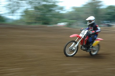 もう半年乗ってないとこんな基本的なことまで忘れちゃってました。 慌ててコースインするも1周で練習時間終了。 ・・・全くコースが覚えられない・・・ オープンしたてのコースで走ったことが無いので、次が右か左か、ジャンプの先がどうなっているのか分からないとさすがにペースがあげられません。 休憩もホドホドに予選スタート。 予選は4周のスプリント。 スタートはスターティングゲートでは無く、ヘルメットタッチスタート。 スタート直後の直線だけは覚えるもへったくれも無いので、アクセル全開。 スタートのタイミングはバッチリ!。 なんとホールショットを取りました!。