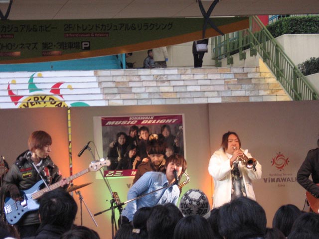ライブは30分くらいやってました。 最前列はファンの人で固められてた。 みんなちゃんと振り付けとか覚えてて「さすが」とか思っちゃった。 男女比は2:8で圧倒的に女性多し。 年齢は結構ばらついてて中高生から死神くらいの人まで幅広い印象。 結構カワイイコもいたなー。 屋外ですごく寒かったけど30分はあっという間でした。