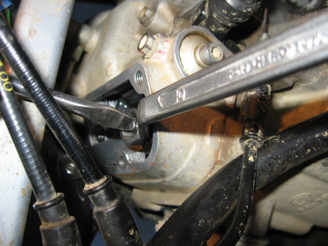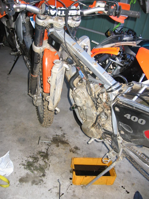 しかしKTMはやはり外車。国産とは勝手が違います。 特徴的なところを挙げると ・ボルトがほとんど8mmサイズ。 これは整備性が良いと思った。工具持ち替えなくていいからね。でもどれも似たようなボルトばかりで、どれがどこのボルトか判らなくなるという諸刃の剣な一面も。 ・オイルのドレンボルトが3個も付いてる。 全部はずさないとちゃんと抜けないらしい。すごく面倒。また、そのうち2個にはフィルター(と言うよりスクリーン?)が付いてる。オイルの汚れはこれでキャッチするつもりらしい。不安。 ・ジェネレーターがオイルに漬かってる これは最初見たとき「あっ、クランクのシールがイッてる。ヤバッ」と思ったんだけど、ローターの裏の方に穴が空いていて、そこを覗いてみるとギヤとかが見えたんでオイルが廻ってくるのは多分正常っぽい。自信ないけど。でもホントこれでいいのか?とても不安。 ・ウォーターポンプがシリンダーヘッドについてる。 なんとカムと直結。国産車じゃクランクの右前にあるのがフツーなんだけどね。いや、ビックリ。でも合理的っていや合理的なのかな?