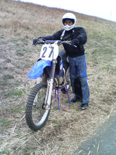 今日、本年の初走りを行ってきた。 走るマシンは'96YZ125。 もう結構ボロイ。 でも良く走るよ。さすがヤマハ。 昨年末に'01KTM400EXCを購入したため、YZをヨメに出すことを最近考えてた。 そこへH川クンが購入希望の意思を示してくれたので早速試乗してもらうことに。 14:00過ぎに近所の河川敷コースN道に到着。 正月だってのに県内のバイクバカが結構集まってます。 早速マシンを下ろし練習開始。 H川クンはまだそれほどオフの経験は豊富ではないので上半身に力がかなり入ってる様子。 時々乗らせてもらってる同僚のCR80とはパワーが全然違うとの事。 俺も途中交代して走る。 ここ最近KTMばっかりでYZは久しぶり。 だけど、ギャップの走破性はYZの方が良くてビックリ。 確かにパワーや直進性はKTMの方が優れてるけど、リアサスの作動性に未だ慣れないんだよね。 なんかKTMを買ったことを後悔しそう。 H川クンも走りこんできてだんだんとペースが上がってくる。 ギャップ走破時やジャンプの時のコツを教えてくと更にペースが上がる。 しかしジャンプ離陸時のアクセルを一瞬開ける感覚が掴めないみたいで、苦慮してるみたい。 そーしてるうちに離陸時にアクセルを開けすぎ「大捲れ」。